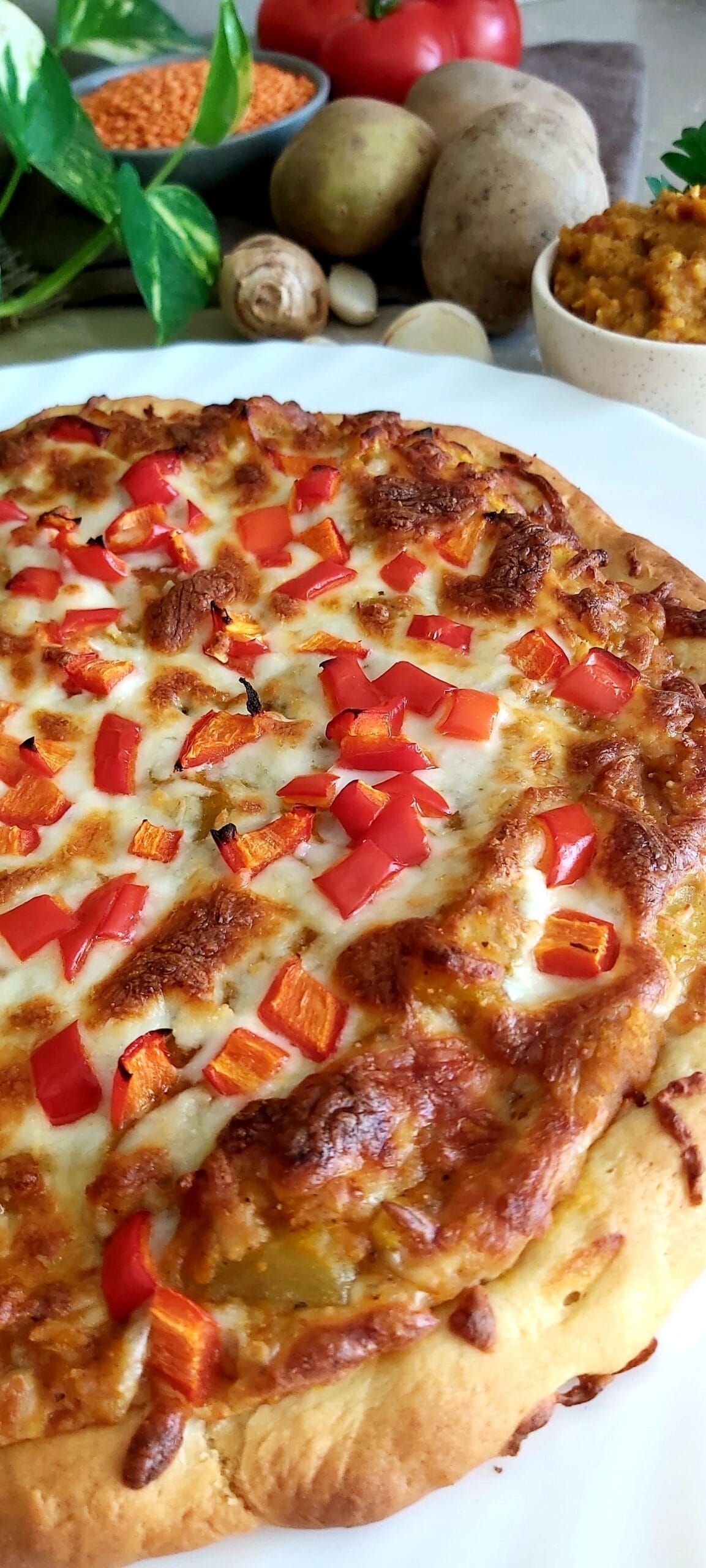For a unique twist on pizza, this Lentil Potato Curry Pizza combines the heartiness of potatoes with the richness of lentils, all packed with bold curry flavours. This vegetarian pizza combines the best of both worlds: a comfort favourite paired with the warmth and spice of Indian-inspired cuisine.