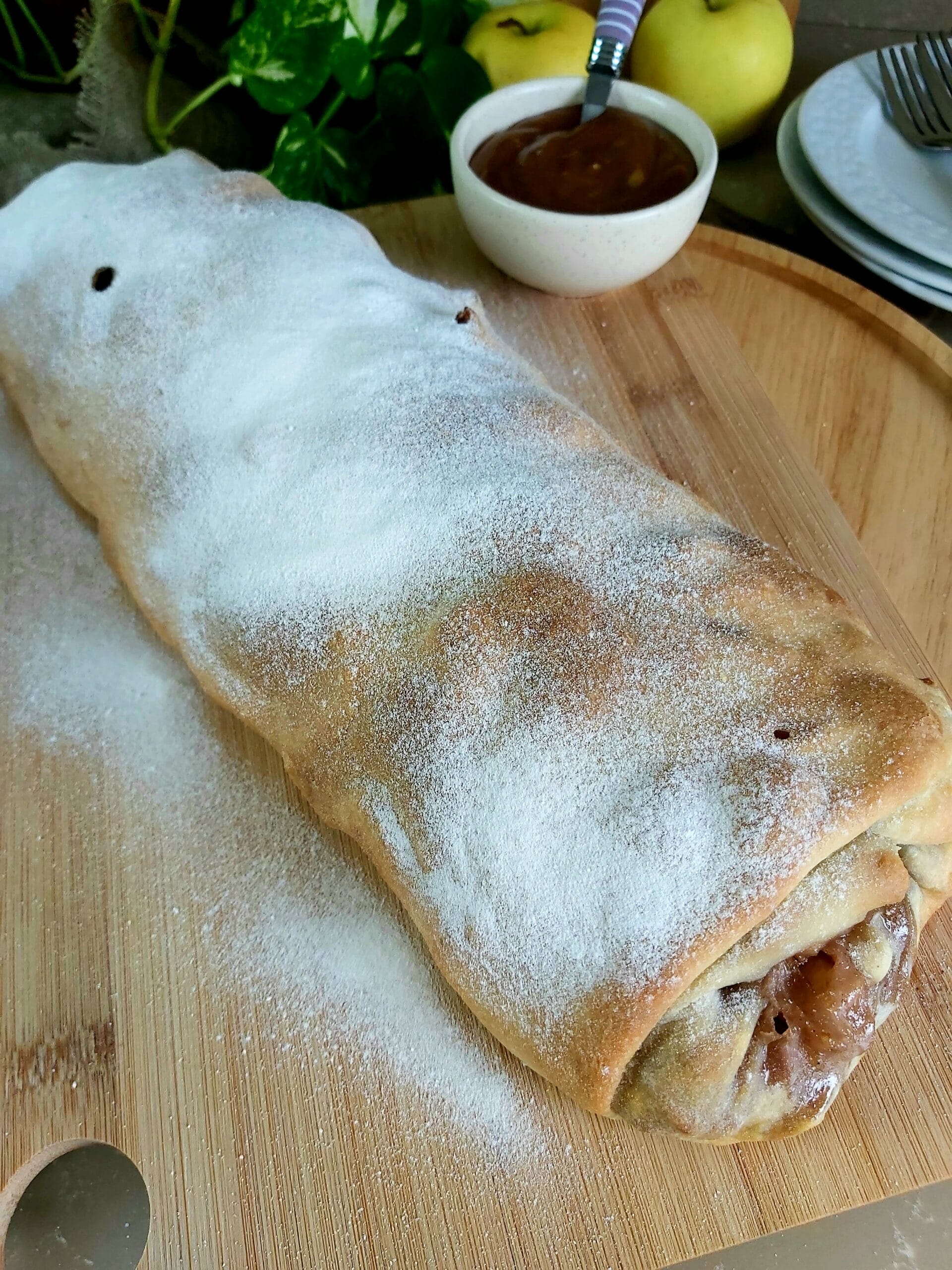 Allow the strudel to cool slightly before dusting it with icing sugar. Slice and serve warm with caramel sauce, whipped cream, or vanilla ice cream.