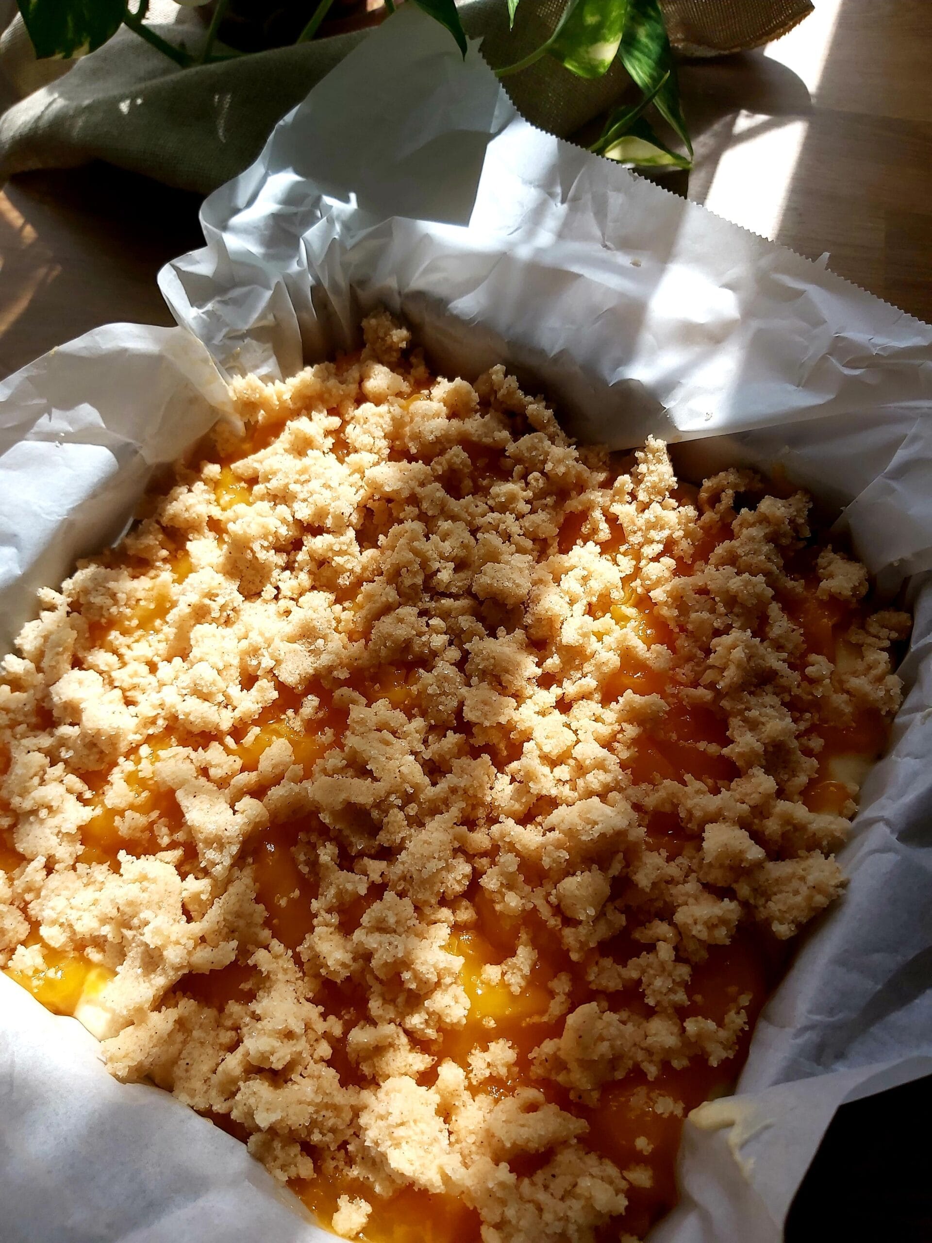 Spread the batter evenly into the prepared baking tin and smooth it out. Distribute the cooked apricot mixture evenly over the cake batter. Finally, sprinkle the streusel topping evenly over the apricot layer.