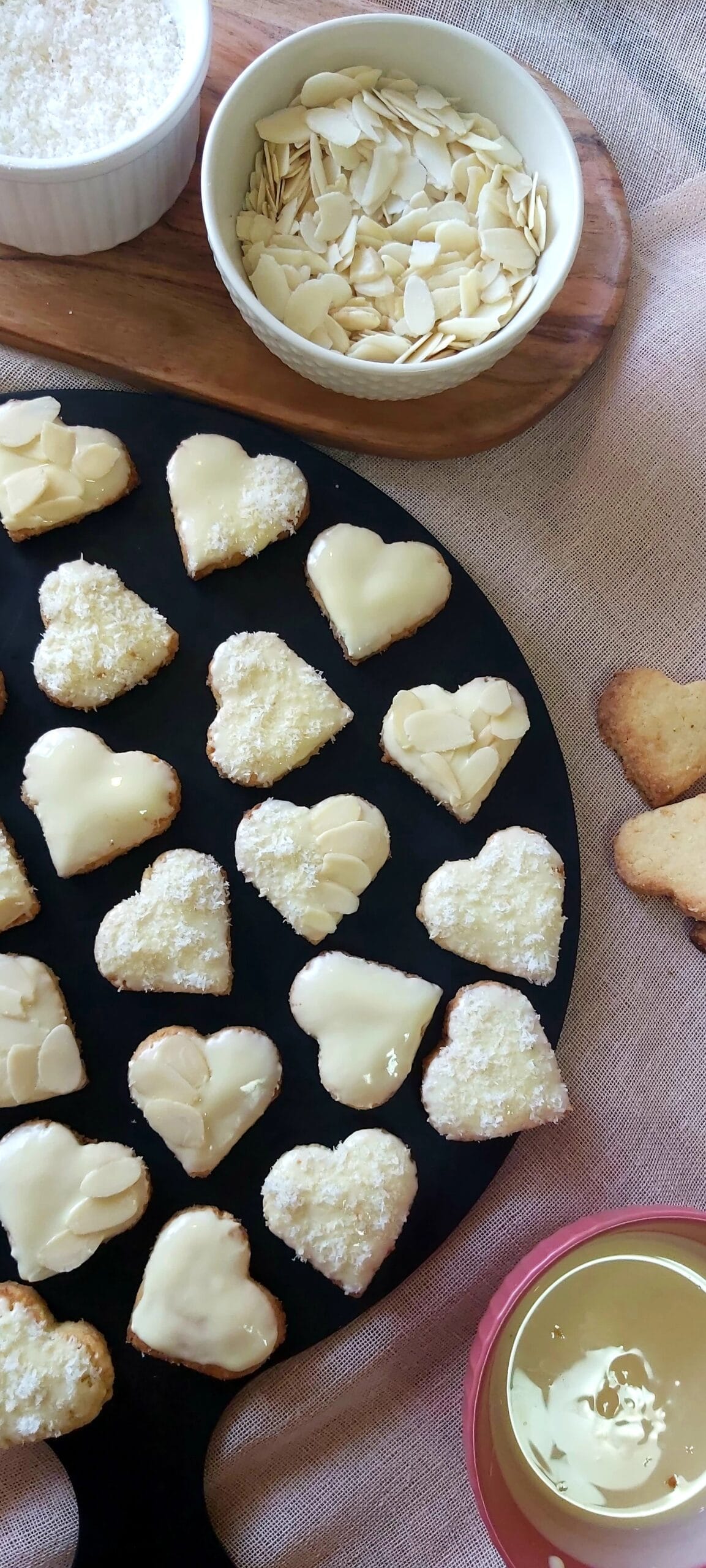 Melt the white chocolate and coconut oil in a heatproof bowl over a water bath. Dip the top of the cookie into the melted chocolate. Sprinkle the cookie directly with coconut flakes or sliced almonds, and place on a tray or plate to dry. It is best to store the coconut cookies in the fridge.