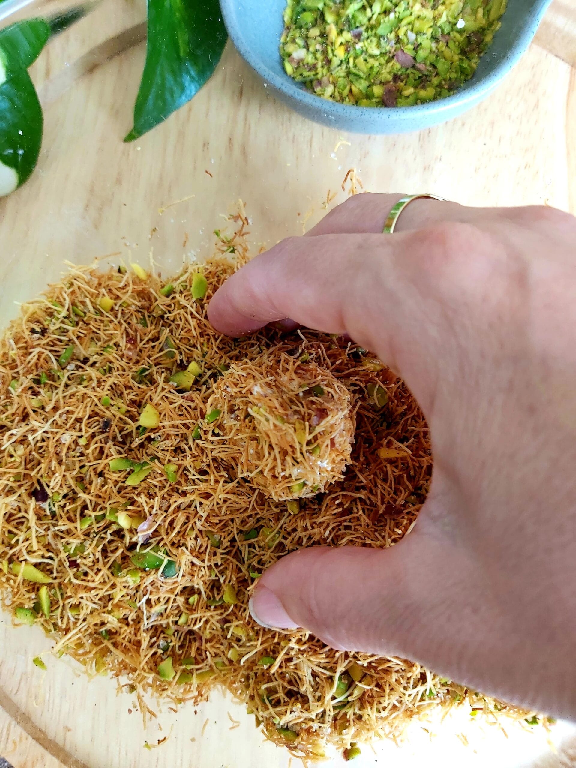 Roll each cheesecake ball in the kataifi mixture, pressing lightly to ensure it sticks.