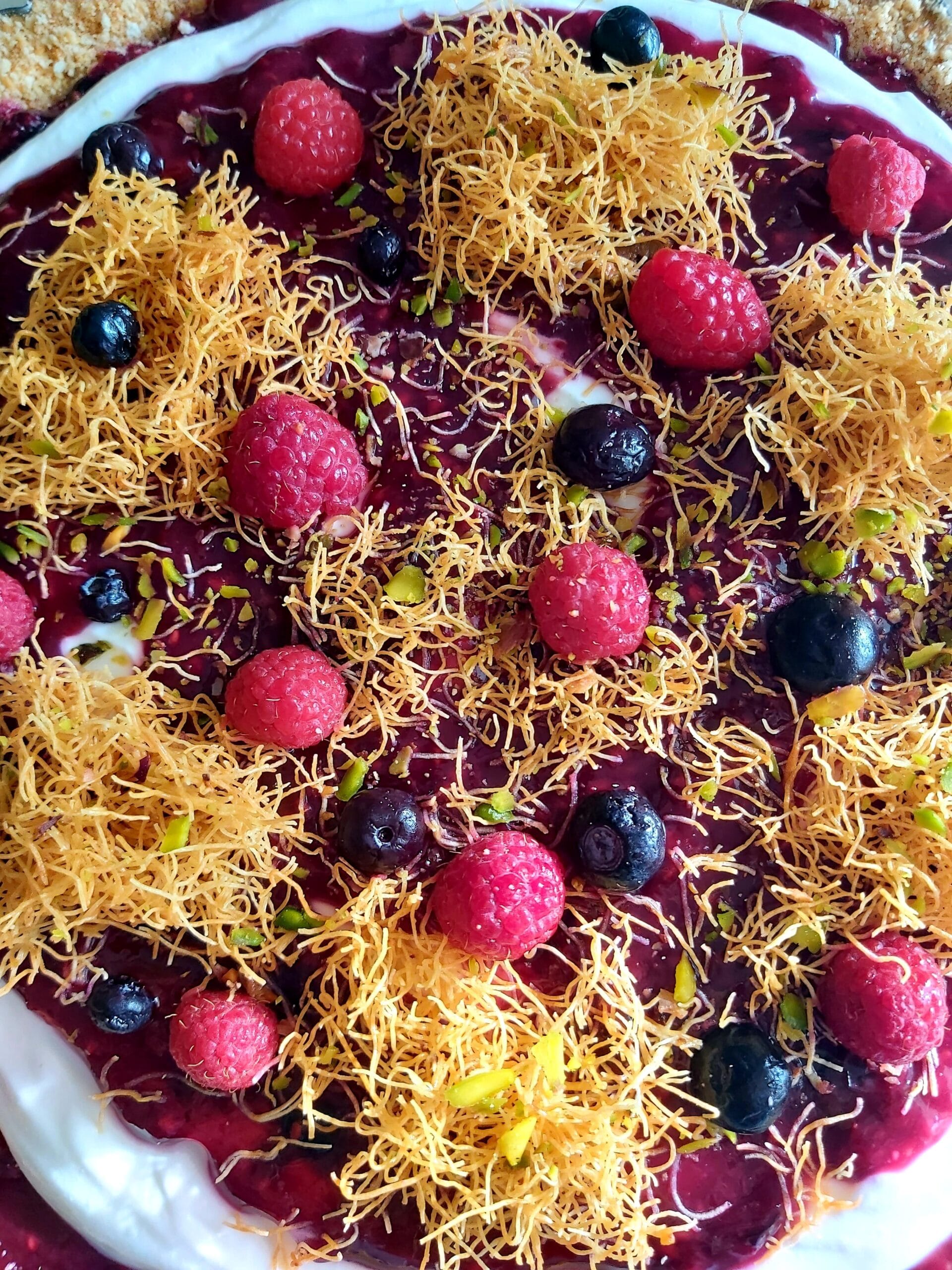 Once the filling is set, sprinkle the crispy kataifi on top and garnish with chopped nuts and fresh berries.