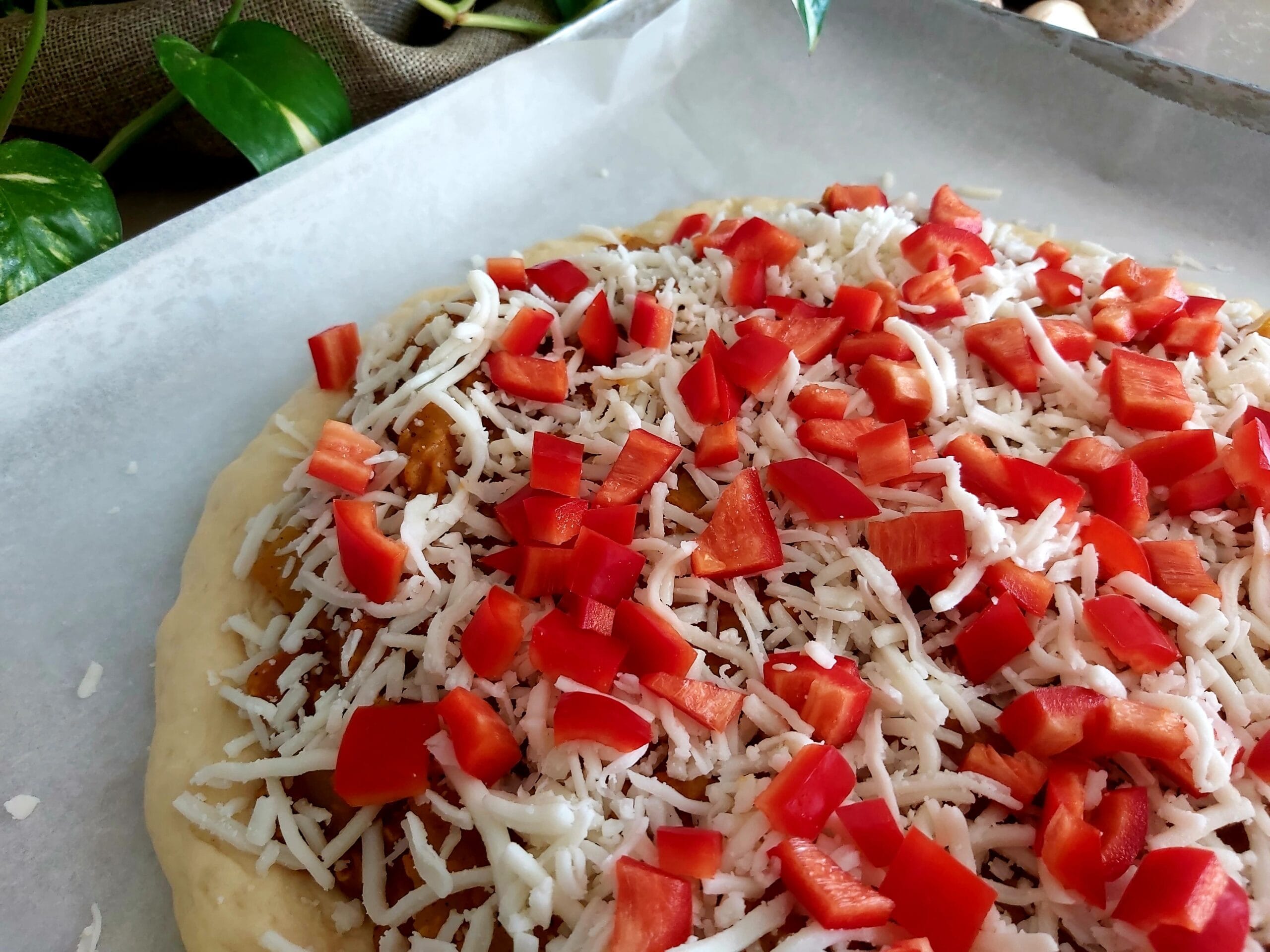 Spread 100 grams of grated Mozzarella cheese over the curry layer. For a pop of colour, top with the diced red peppers.