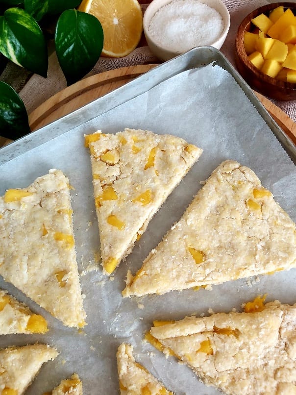 Once baked, allow the scones to cool slightly. Then serve them warm or at room temperature with mango curd.