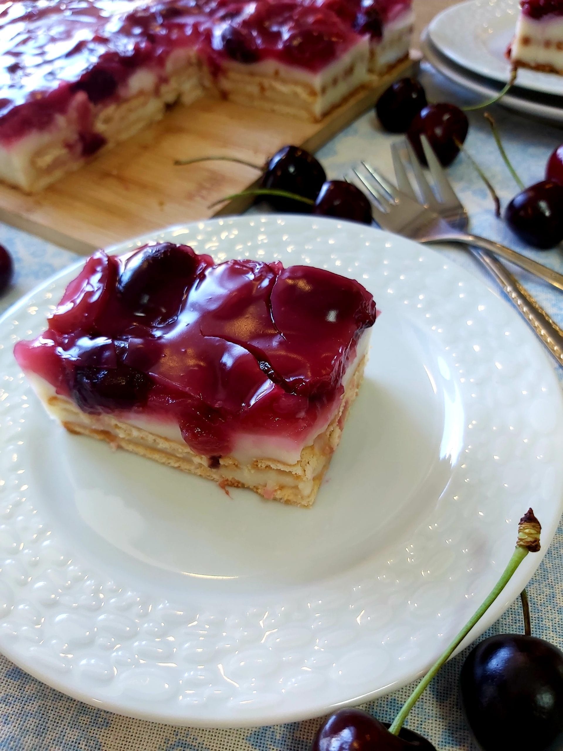 Spread a layer of the biscuits in the cake frame, and then spread half of the vanilla custard on top. Repeat the process one more time. Finish with a layer of cherry topping. Place the cake in the refrigerator and let it chill for at least 2 hours, or until the filling is set.