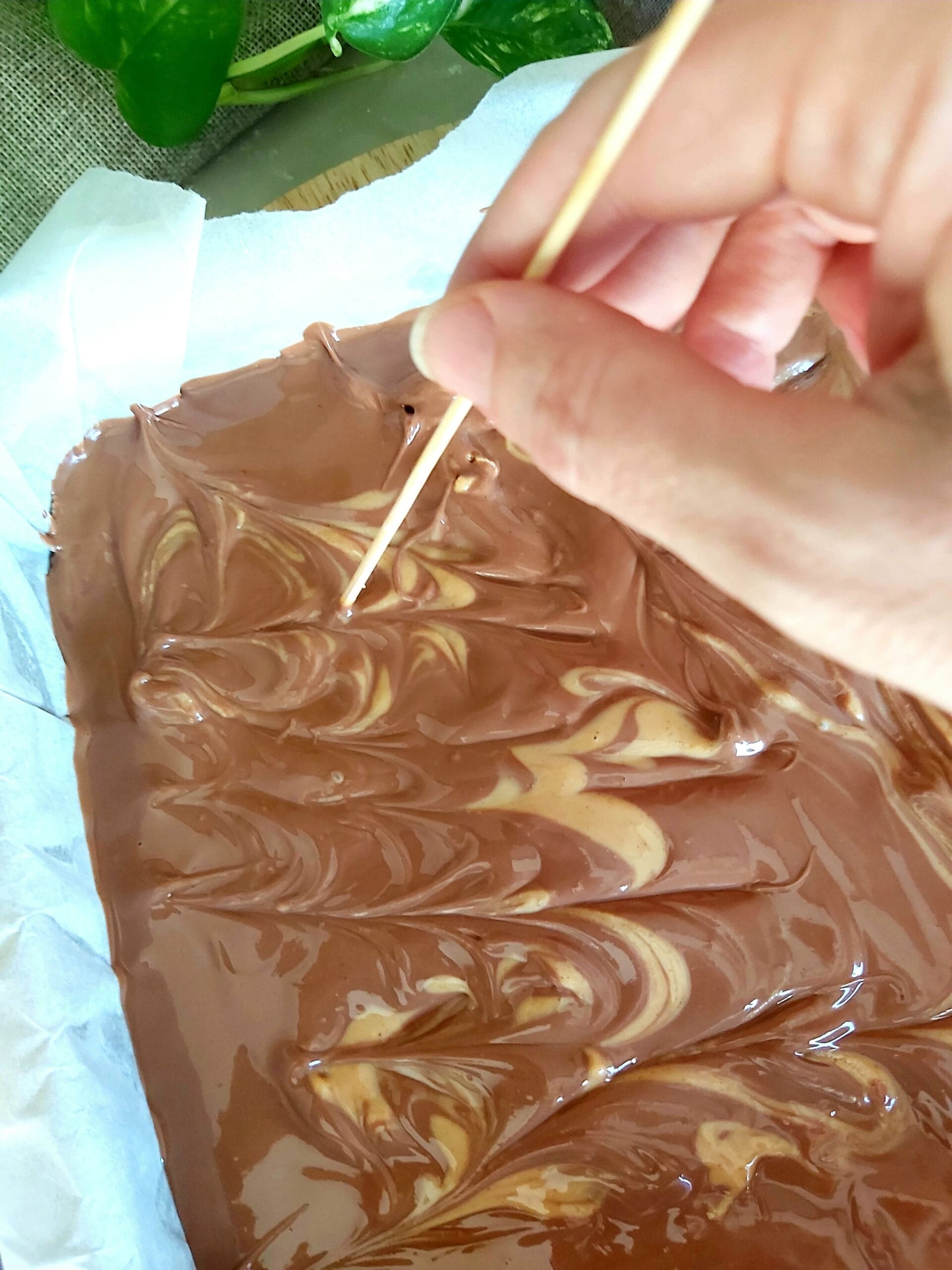 Spread small dollops of peanut butter over the melted chocolate, then swirl with a toothpick for a decorative look.