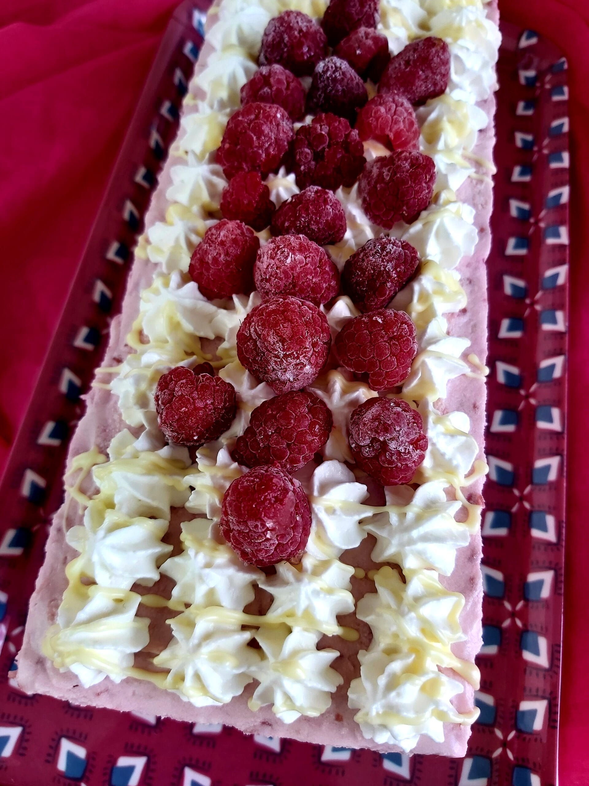In a separate bowl, whip 200 millilitres of whipping cream until soft peaks form. In another bowl, beat 400 grams of cream cheese and 120 grams of caster sugar until smooth. Stir the melted white chocolate into the cream cheese mixture. Gently fold the whipped cream into the cream cheese mixture until well combined. Spread half of the cream cheese mixture evenly over the biscuit base in the loaf tin. The other half of the cream is used for the raspberry filling. The loaf tin can be placed back in the refrigerator to allow the filling to set.