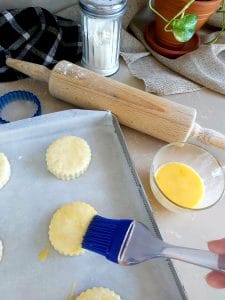 Arrange the scones on the baking tray lined with parchment paper, brush with a beaten egg, and bake in the preheated oven for 15 minutes. Allow the scones to cool slightly before serving.