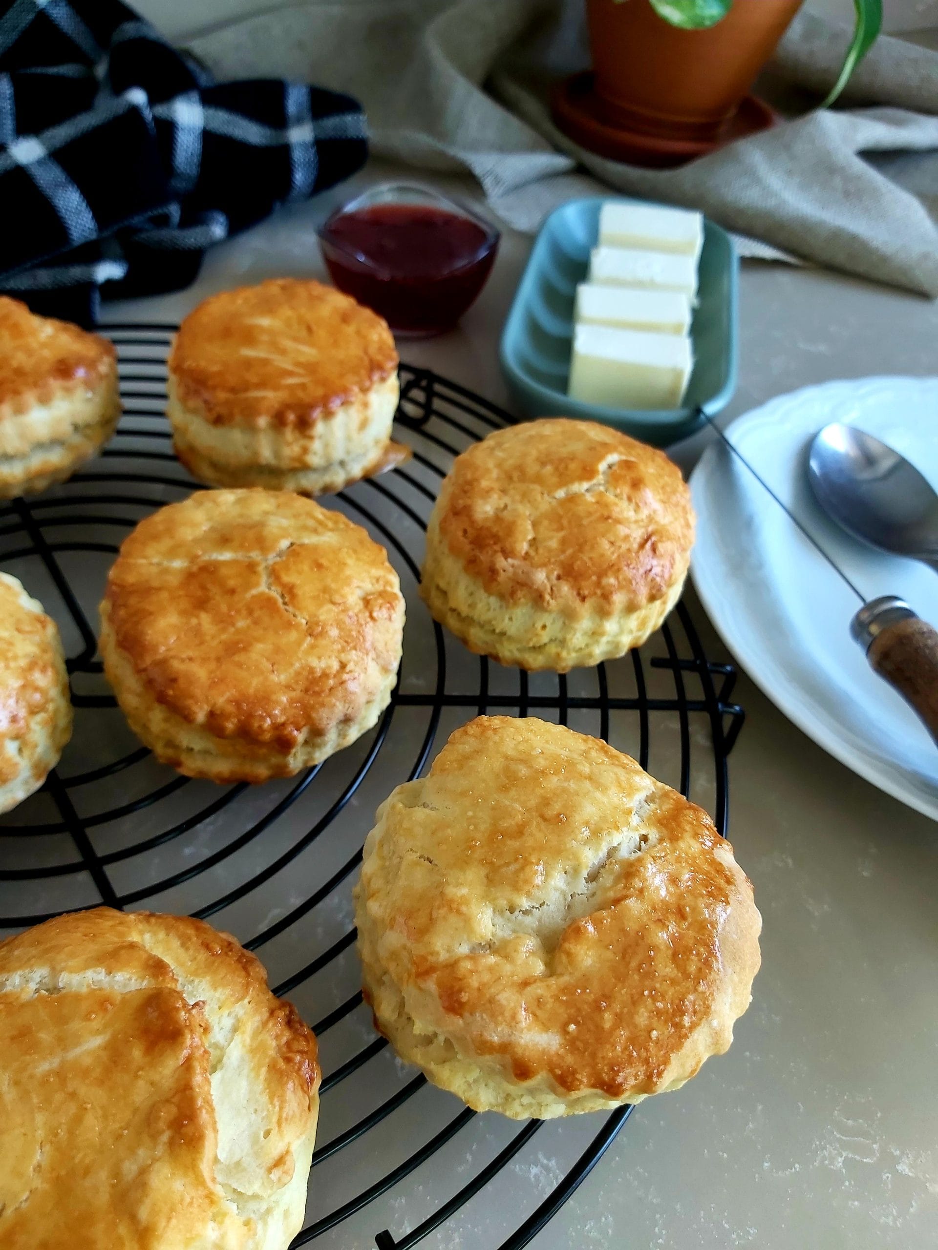 Roll out the dough on a lightly floured surface to about 2.5 cm (1″) thick. Take a round cookie cutter (mine is 6 cm/2 ½” in diameter) and dip it in some flour. Cut out as many scones as possible, knead the remaining dough again, and repeat the process. I got nine scones in total.