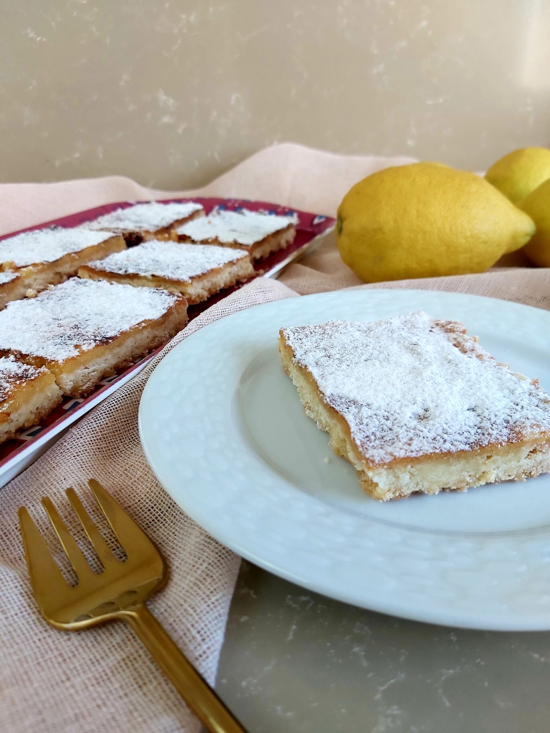 Allow the lemon bars to cool completely in the baking tin. Once cooled, cut the lemon bars into squares or rectangles with a sharp knife. For a decorative touch, dust the top with icing sugar before serving.